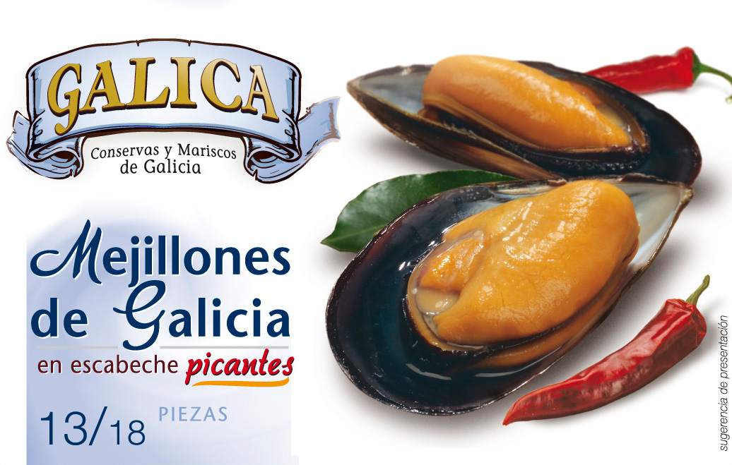 Mejillones de Galicia, aceite de girasol, vinagre, especias y sal.